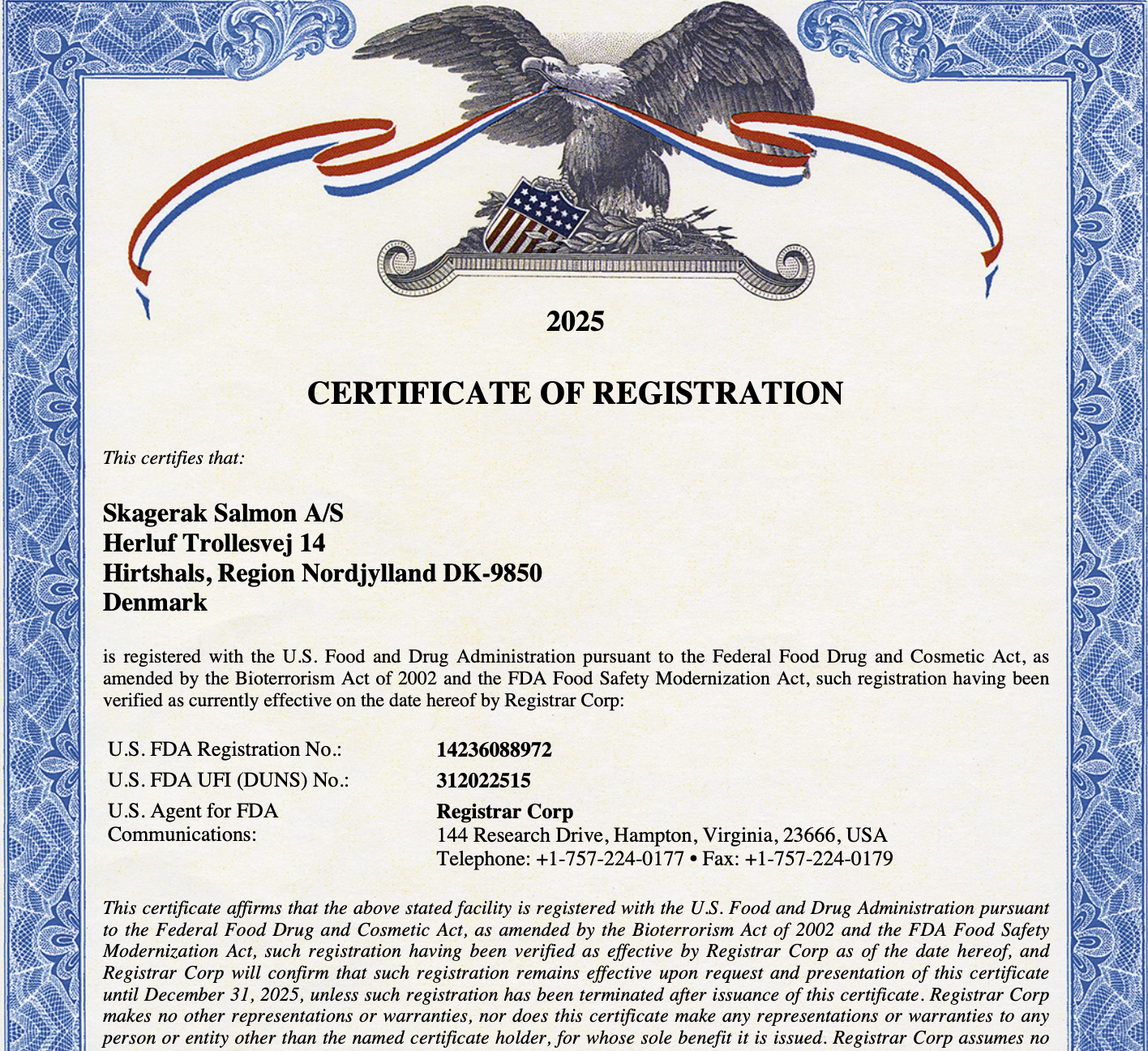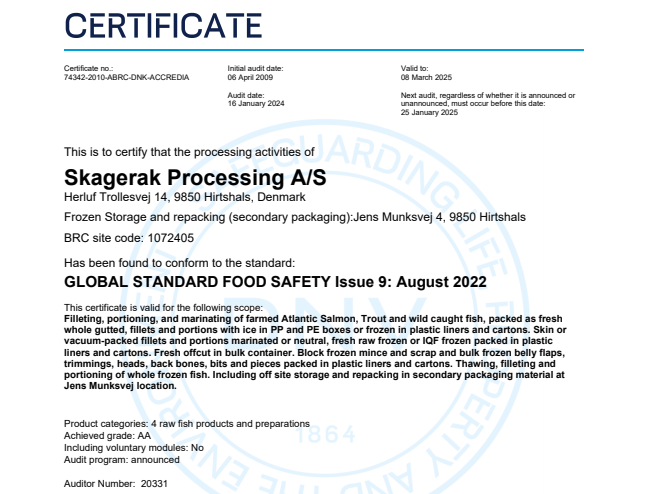 Globally certified for food safety, traceability, and responsible salmon processing.